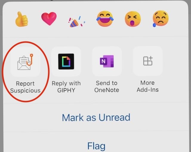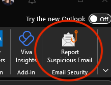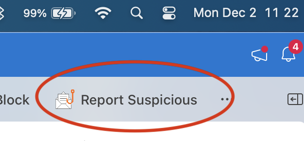 - Click the "Report Suspicious" button in the ribbon across the top, to the right-hand side. If you do not see the button here, click the ellipses menu and locate it there.