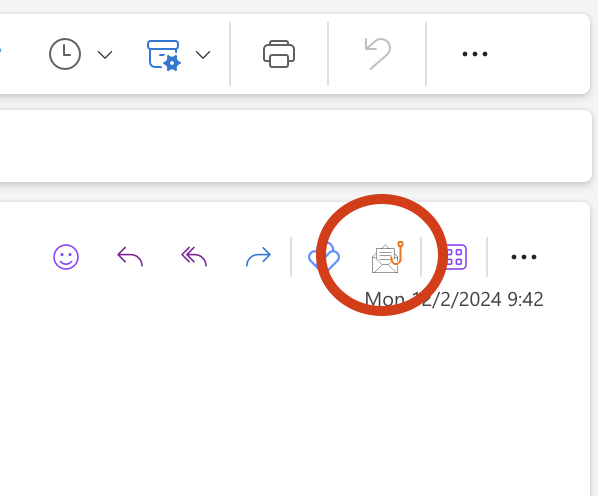 - In the top right corner of the email selected, you should see a white envelope icon with a little orange hook. Click this icon. (If you hover over it, it will read "Click to report suspicious emails to IT.")